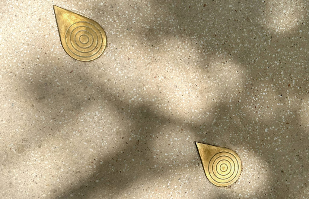 Le projet s’attache également à renforcer l’esprit du lieu : grâce aux échanges avec les habitants en concertation, les fameuses gouttes d’or sont évoquées sur le sol de la place avec des clous en laiton qui « s’écoulent » le long de la pente.